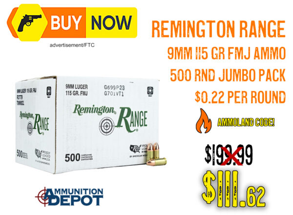 Ammunition Depot has Remington Range 9mm 115 Gr FMJ Ammo 500 round Jumbo Packs marked down to $111.62 with code ALand5 at checkout—that is over 40% off! You save $88+.