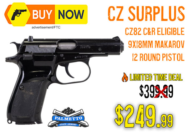 Palmetto State Armory has CZ-82 Used Surplus C&R 9x18mm Makarov Pistols marked down to $249.99, which is roughly 37% off this classic pistol. Limited-time deal. Surplus pistols, conditions of wear may vary.
