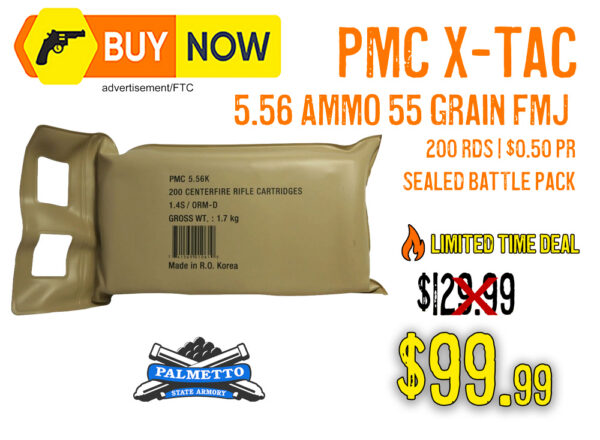 Palmetto State Armory has this PMC X-Tac 5.56 NATO 55gr FMJ 200rd Sealed Battle Pack marked down to $99.99, that is 23% off. Deals like this don’t stick around. Stock up on reliable range ammo while it’s 50¢ per round.